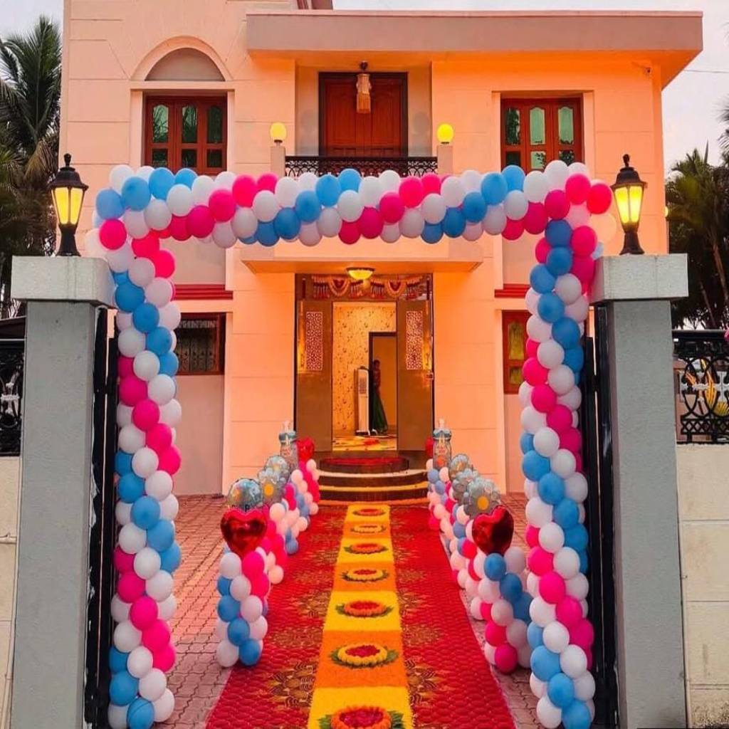 Welcome guests in style with our grand entrance balloon decoration in pink, blue, and white. Perfect for housewarmings and other memorable celebrations.